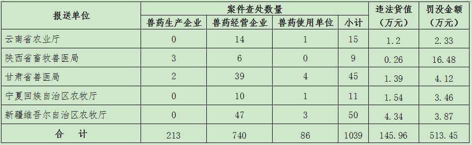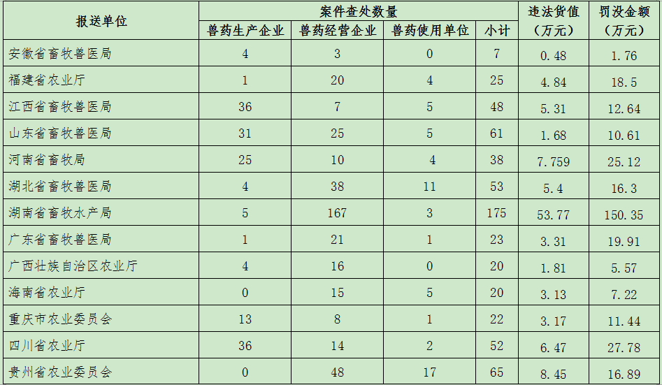 2017年下半年,北京市农业局等29个省级兽医行政管理部门,认真落实兽药“检打联动”制度,积极组织开展假劣兽药查处工作,对兽药违法违规行为持续保持从严处罚高压态势,取得了良好成效。据统计,29个省份共立案查处案件1039件(详见附件),其中兽药生产环节213件、经营环节740件、使用环节86件,货值金额总计145.96万元,罚没款总计513.45万元。