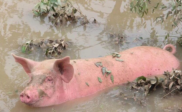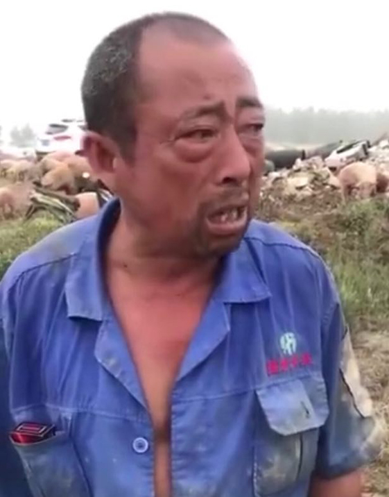 因洪水水量较大,养殖大棚垮塌后,大小不一的猪四处散落,有的趴在堤坝上奄奄一息,有的在坝边游动,大批死猪还飘在坝子里的水中。洪水退去后,养殖场老板杨跃喜站在一座高出水面的桥上伤心痛哭。